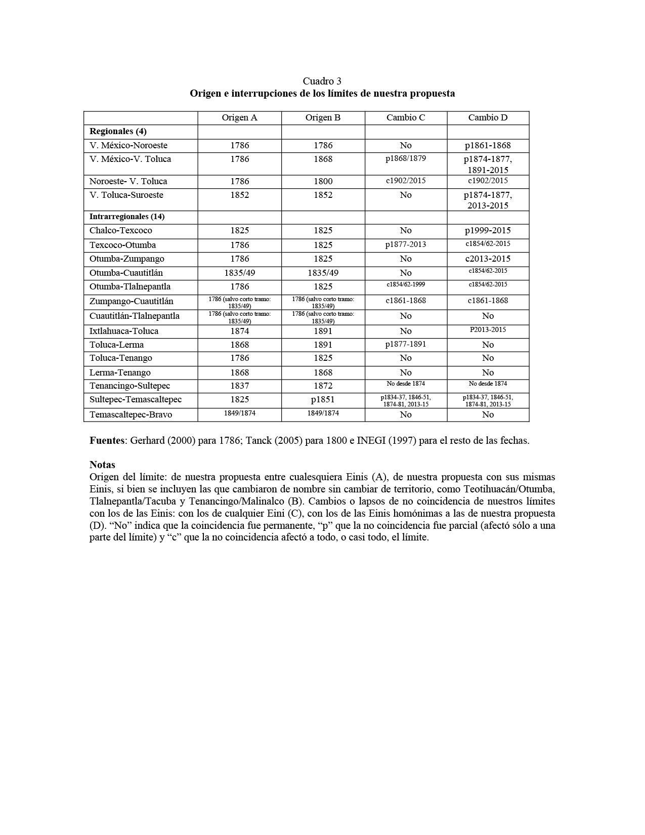 Los tres límites restantes de nuestra propuesta (uno regional y dos interregionales), si bien también tienen orígenes muy antiguos (en los tres casos es mayor de dos siglos), a diferencia de los 15 anteriores, no han coincidido, total o parcialmente, con límites de entidades intermedias durante lapsos prolongados. Por un lado, nuestros límites de Otumba-Tlalnepantla y Texcoco-Otumba, después de coincidir con límites de entidades intermedias en torno a un siglo, dejaron de hacerlo, completamente en el primer caso y parcialmente en el segundo, por más de una centuria, hasta que tal coincidencia se restableció, en el primer caso en 1999, cuando se erigió el distrito judicial de Ecatepec, y en el segundo caso en 2013, cuando el municipio de Teotihuacán fue traspasado del distrito judicial de Texcoco al de Otumba. Por otro lado, nuestro límite Noroeste – Valle de Toluca, tras una existencia secular como límite de entidad político-administrativa, dejó definitivamente de tener este fundamento en 1902, cuando la erección del distrito de El Oro dejó sin referente político-administrativo a casi la totalidad de tal límite.