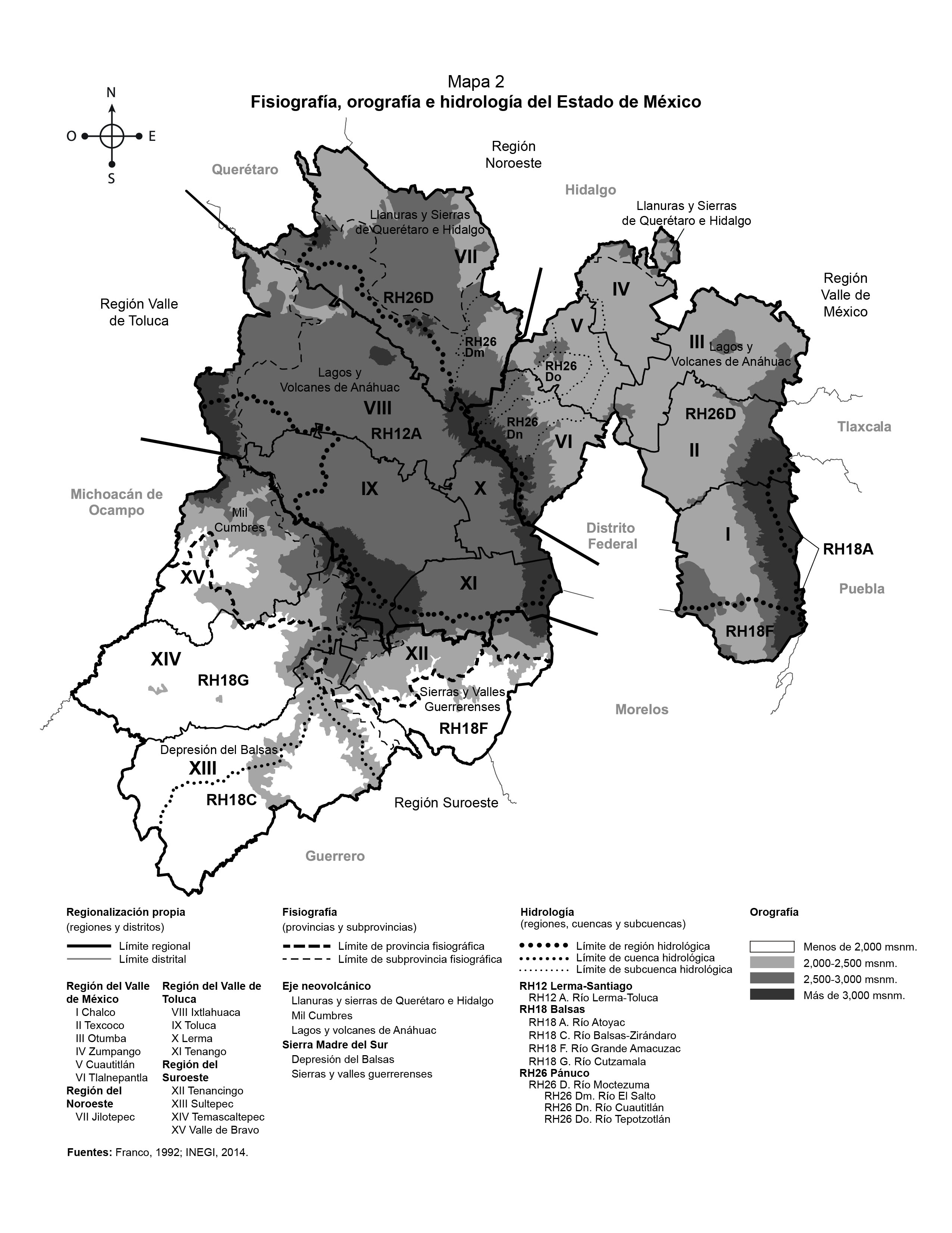 Los elementos de geografía del medio físico presentados permiten demostrar que nuestros cuatro límites regionales tienen sólidos fundamentos naturales, como en parte se refleja en el mapa 2. En principio, cabe señalar que estos cuatro límites se relacionan con unidades de relieve con pendientes abruptas y, por tanto, escasamente pobladas, que podrían catalogarse como sierras, en la mayor parte de los casos, o como cañadas (en el caso de las estribaciones septentrionales de la sierra de las Cruces), con excepción del tramo occidental del límite Valle de Toluca – Suroeste. Sin embargo, los límites regionales, que, como sabemos, en nuestra propuesta siempre se expresan a través de límites municipales, guardan dos tipos de relación con tales unidades de relieve: en la mayoría de los casos las atraviesan, de manera que la sierra en cuestión es compartida por municipios de las dos regiones colindantes; pero también sucede que el límite regional se ubica al inicio de la sierra que sirve de límite, de manera que dicha sierra pertenece en su totalidad a una sola región. En el primer caso, se encuentran las dos sierras más elevadas de entre las que se encuentran al interior del Estado de México:14la de las Cruces, que separa el Valle de México del Noroeste y del Valle de Toluca; y la sierra Xinantécatl, que separa el Valle de Toluca del Sureste. En estos dos casos, nuestros límites regionales se justifican a partir tanto de las sierras involucradas en ellos como de las líneas divisorias que, cabalgando sobre tales sierras, separan regiones hidrológicas, pues, como sabemos, la sierra de las Cruces separa las regiones hidrológicas de los ríos Pánuco y Lerma, en tanto que la sierra Xinantécatl divide las cuencas hidrológicas de los ríos Lerma y Balsas. En el segundo caso, se encuentra la sierra de Timilpan, que pertenece en su totalidad al Noroeste y cuyo inicio meridional separa esta región de la del Valle de Toluca.