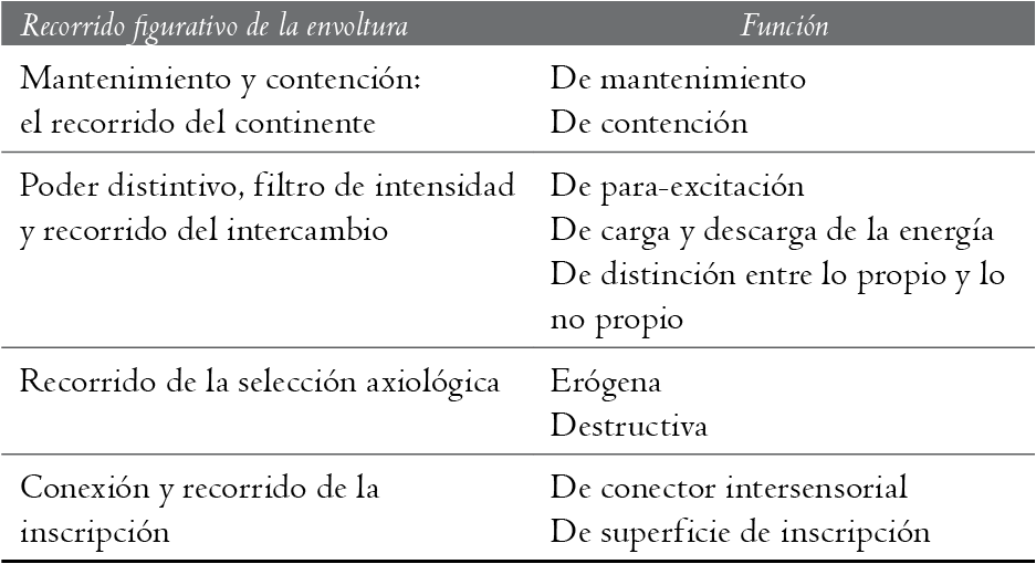 El cuerpo, en cuanto origen de las pulsiones, es un campo figurativo, un lugar de comunicación, un yo-piel en términos de Didier Anzieu, de cuyos presupuestos Fontanille parte para destacar que el cuerpo manifiesta un yo, referido a la carne sensible, y un sí: una envoltura cenestésica –envoltura psíquica– capaz de controlar o regular las descargas de energía. Esta es generadora de barreras de contacto; es decir, establece mecanismos que controlen y clasifiquen las sensaciones en buenas o malas, por ejemplo. El concepto de envoltura cenestésica resulta de gran importancia para este acercamiento dado que permitirá reflexionar en torno a la conciencia sensorial que los personajes asumen de su propio cuerpo y que emana del contacto con el cuerpo ajeno. Así, debe considerarse que se sigue el planteamiento de Fontanille, quien agrupa las nueve funciones de la envoltura, indicadas por Anzieu, en cuatro recorridos figurativos, según se acota en la siguiente tabla: