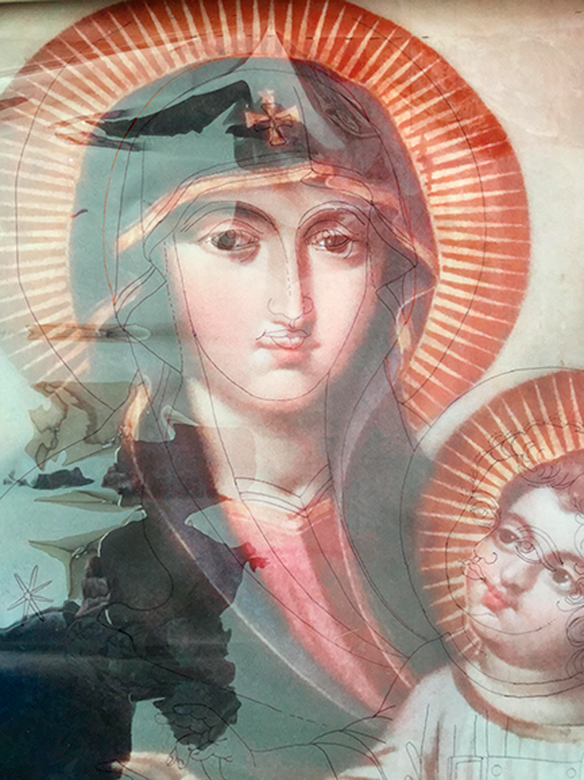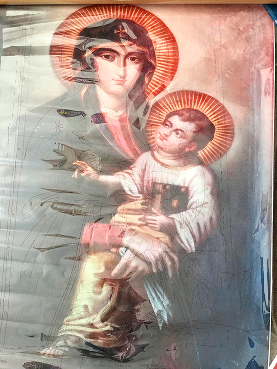 En los primeros exámenes se compararon las figuras principales de la composición (la Virgen y el Niño) con la intención de localizar coincidencias en el dibujo. Posteriormente, se realizaron nuevos cotejos, pero en estas ocasiones se buscó que coincidieran los bordes marcados en la calca como pertenecientes a la pintura original de la Virgen del Popolo del siglo xvi; es decir, en la calca se ubicó el borde de la pintura romana y se comparó con las reproducciones de Pátzcuaro, respetando la inclinación de perspectiva utilizada por Correa, pero tampoco se encontraron coincidencias. Más aún, se realizó la medición del lienzo original del collage y este resultó de 61 por 104 centímetros. Este dato resulta interesante, pues cuando en el proceso de análisis reprodujimos el lienzo para que correspondiera con la superficie del collage tampoco coincidieron las imágenes en tamaño, a pesar de estar proporcionalmente cercanas en dimensiones. Asimismo, fue evidente que hubo tratamientos diferentes entre ambas pinturas en cuanto al dibujo, la aplicación del color y la composición; en otras palabras, la relación entre ambas obras no fue la esperada.