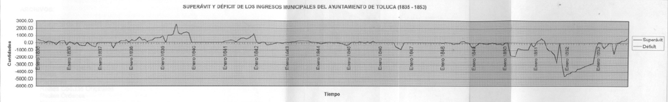 La drástica reducción de la autoridad municipal en Toluca se vio reflejada en el aspecto político. Hubo una notoria ausencia de los capitulares a las sesiones de cabildo, en ocasiones se encontraban solo dos o tres integrantes en dichas sesiones. También en la tendencia a la baja en los ingresos municipales a inicios de la segunda mitad del siglo xix. En efecto, entre 1850 y 1853, los egresos superaron con amplio margen a los ingresos, profundizando la tendencia descendente anterior. La Gráfica 121 nos muestra la evolución de los ingresos y egresos del Ayuntamiento de Toluca entre 1835 y 1853; en ella puede verse que solo en algunos años la hacienda municipal alcanzó superávit, pero, repetimos, la tendencia dominante fue el déficit. Un análisis más detallado permite identificar tres periodos que siguen comportamientos distintos; el primero va de 1835 a 1837, el segundo de 1838 a 1841 y el tercero de 1842 a 1845. El primer periodo se caracteriza por un movimiento preponderantemente deficitario en las finanzas del Ayuntamiento de Toluca: los ingresos son relativamente bajos comparados con los egresos del mismo periodo. En el segundo se observa claramente el estado superavitario del erario público, al tener ingresos de más del doble que en el periodo anterior, manifestándose una disminución considerable de los gastos. En suma, se da una bonanza en la recaudación, que combinada con la baja en el gasto y permitió un superávit de más del cincuenta por ciento. El tercer periodo es el más estable de los tres, ya que las finanzas se mantienen relativamente constantes, alrededor del equilibrio entre ingresos y egresos. También se observa que la recaudación fue similar a la del primer periodo, es decir, considerablemente menor al periodo anterior; de igual manera, los egresos tuvieron gran variación, ajustándose de cierta manera a los ingresos. De forma simultánea se puede ver el comportamiento de la diferencia entre ingresos y egresos, es decir, la relación déficit-superávit. El comportamiento está ligado al movimiento intermedio de las curvas de ingresos y egresos. A partir de mediados del año 1848 se observan movimientos erráticos en el erario, con una fuerte tendencia deficitaria. Estos movimientos se agravan hasta diciembre de 1851, cuando se alcanza el mayor déficit público del periodo examinado. En los años subsecuentes, las finanzas públicas continúan con la inestabilidad, pero rondando cerca del equilibrio.22