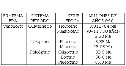 Este ensayo en gran parte dilucidará varias de las afirmaciones y observaciones que integran esta larga cita. Es importante aclarar que el Antropoceno se define, provisionalmente, como una época geológica, es decir, que se acepte como tal depende de la Comisión Internacional de Estratigrafía (cie), de otra manera, debería admitirse que el Holoceno continúa. Asumir la vigencia de la época geológica del Antropoceno implicaría reconocer que los seres humanos hemos cambiado el funcionamiento de la Tierra a escala global con tal magnitud que, como evidencia, existen huellas lo suficientemente visibles en el registro geo-ecológico, aunadas al cambio climático y el calentamiento global del planeta. Sirva la siguiente tabla cronoestratigráfica y geocronológica para situar este periodo en el tiempo (Tabla 1).
