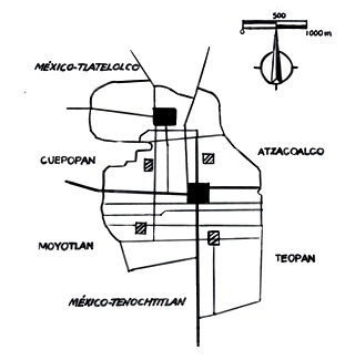 Otro componente de cada calpolli, tlayacatl o tecpan es el tlaxilalcalli. Los especialistas han encontrado un número variable de tlaxilalcaltin en cada parcialidad que integra el altepetl (Carrasco, 1996; Lockhart, 1999). En los tlaxilalcaltin conviven tanto los espacios ocupados por las instituciones religiosas, políticas y administrativas como las áreas habitacionales de los moradores encargados de producir los mantenimientos y el tributo (Reyes, Celestino, Valencia, Medina y Guerrero, 1996). Según el modelo anterior, hacia 1521, el altepetl de Tenochtitlan, uno de los cuatro calpolli, tlayacatl, o tecpan, era Teopan, ubicado en el sector sureste del emplazamiento principal. Teopan, a su vez, se componía de varios tlaxilalcaltin (figura 1).