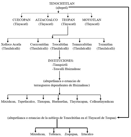 Ahora bien, además de los conceptos calpolli y tlayacatl, la documentación temprana sobre la ciudad de Tenochtitlan registra el término tecpan para referirse al lugar de residencia del señor local que administra cada calpolli y tlayacatl (Lockhart,1999), de tal suerte que la diversidad de conceptos empleados para identificar las entidades político-territoriales que integran un altepetl termina por empañar nuestro conocimiento sobre su estructura. Por ejemplo, en el caso que aquí nos ocupa, dependiendo de las fuentes, Teopan puede aparecer como calpolli, tlayacatl o tecpan.