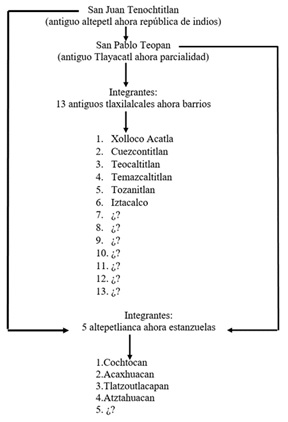 A pesar de estas innovaciones en el gobierno nativo, resulta claro que medio siglo después de iniciada la reconfiguración espacial de Tenochtitlan poco se había avanzado en la modificación de la estructura administrativa precedente. Así, por ejemplo, hacia 1570 el clérigo Alonso Fernández de Segura registra la composición de su feligresía empleando criterios nativos y occidentales. De San Pablo dijo ser uno de los cuatro principales de la Ciudad de México, y estar compuesto por doce tlaxilalcales “que son como doce barrios pequeños” (Descripción, 1897 [1570]: 278). Un treceavo integrante, Iztacalco, indica Fernández, ha pasado a la administración de otro clérigo por lo que no la incluye dentro de su contabilidad inicial. En cambio, registra con minuciosidad el nombre de “cinco estanzuelas pequeñas” —en realidad solo cita cuatro— (Descripción, 1897 [1570]: 278) que también componen la parcialidad de San Pablo, a saber. Cochtocan, Acaxhuacan, Tlatzoutlacapan, Atztahuacan (esquema 2).