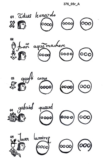 Por el momento, deseamos concluir con otra propuesta: es necesario el estudio sistemático de los antropónimos de los tributarios de Teocaltitlan, pues en el acercamiento que aquí hemos hecho encontramos una rica veta que nos puede ayudar a la mejor comprensión de un fenómeno aun no resuelto por la historiografía de este periodo. Nos referimos a la importancia del idioma náhuatl, representado en los glifos que designan a los tributarios, como vehículo que posibilitó la permanencia en el tiempo largo de ciertas prácticas de tradición mesoamericana, entre ellas la asignación de nombres calendáricos, parcialmente encubiertas con el manto de sacralidad de la pléyade del santoral cristiano. En conclusión, el ltspt es un testimonio de los procesos de asimilación, superposición y asociación, verificados entre dos maneras de ver y concebir el mundo, en un punto del derrotero que culminó con el nacimiento de una sociedad totalmente diferente de la que atestiguó los acontecimientos de 1519 a 1521.