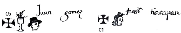 En la misma situación está el caso de Francisca Tiacapan (folio 24v, primer lugar en la lista), la cruz patada precede a su representación gráfica, pero no tiene relación alguna con su nombre y apellido. Al igual que Juan Gómez no tiene registro del tributo. En resumen, la cruz patada representa una incógnita, y consideramos que más que un elemento para indicar el nombre es una marca de distinción empleado en el ltspt para señalar que ambos estaban exentos de pagar tributo, probablemente porque pertenecían al sector noble y privilegiado que frente a las reformas del visitador Valderrama vio afectados sus intereses. Esto es claro en el ejemplo de Juan Gómez, que porta un sombrero a la usanza hispana, lo que indica su estatus social (figura 3).