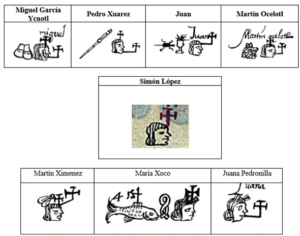 Al margen de los casos antes señalados, hay un grupo de ocho tributarios, cinco casados y tres viudos, con marcas de distinción (figura 4). Se trata de un lazo gráfico que sale de la cabeza, la frente o de la boca de estos personajes, y culmina en forma de cruz potenzada, cuyos extremos tienen la forma de una T mayúscula. Todos han pagado su tributo, de acuerdo con su condición de enteros o medios. Pero, nuevamente, la marca nos plantea más inquietudes que certezas. La conjetura que ofrecemos sobre el particular es que se trata posiblemente de funcionarios de la Iglesia, al servicio de la evangelización, que durante mucho tiempo gozaron del privilegio de mantenerse al margen de las cargas fiscales, y aunque ahora se les ha incorporado en el padrón general de tributarios de Teocaltitlan, el pintor amanuense deja constancia de su condición anterior en el ltspt. También debemos considerar que la variedad en la disposición de las cruces en los rostros puede deberse a la posible intervención de diferentes pintores amanuenses en la confección del libro de cuentas.