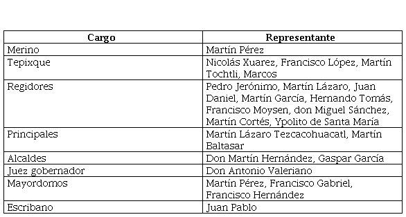 Es probable que, en cada pueblo de indios, para la época en que fue elaborado el libro de cuentas de Teocaltitlan, se llevara un recuento pormenorizado de los tributos y los tributarios, y que fuera facultad del cabildo y sus miembros decidir sobre la distribución y aplicación de las cantidades recaudadas. Lamentablemente no han llegado hasta nosotros más ejemplos de contabilidad fiscal de carácter mixto —esto es, en el que se combinan glifos para formar antropónimos de los tributarios y glosas en náhuatl, en las cuales se describen la condición social de los tributarios, con el conjunto de anotaciones en castellano que atestiguan la presencia y consolidación del modelo de gobierno basado en el cabildo—; en consecuencia, la particularidad de esta memoria y su carácter inédito nos ofrece la posibilidad de una interpretación diferente de su contenido, es decir, al margen de los análisis que enfatizan el aspecto cuantitativo. Al respecto, en la tabla 1, incluimos la composición del cabildo de Tenochtitlan que dio fe de la recaudación del tributo en dinero.