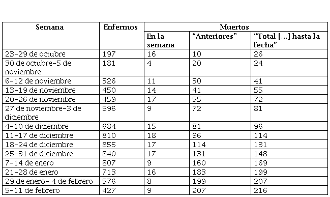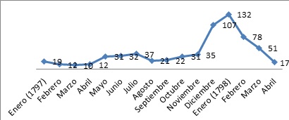 Como se observa en los cuadros 2 y 3, salvo la semana del 30 de octubre al 5 de noviembre de 1797,8 la epidemia aumentó gradualmente en el transcurso de los meses hasta la penúltima semana de diciembre. De acuerdo con los citados reportes semanales, la epidemia se desarrolló con mayor intensidad durante el mes de noviembre y las tres primeras semanas de diciembre de 1797. Desde la última semana de diciembre, la población comenzó a recuperarse paulatinamente. Desconocemos la fecha en la que el flagelo dejó en paz a los habitantes de la villa de Orizaba. En este caso, se sugiere que fue a finales de febrero de 1798, porque como se muestra en el cuadro 2, en este último mes el número de personas enfermas fue disminuyendo.