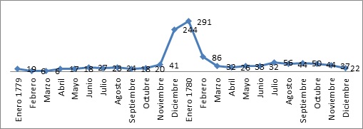 En cuanto a la epidemia de 1779-1780, en estos años se anotaron 463 y 753 óbitos respectivamente.9 El número de fallecimientos fue mayor en comparación con los registrados en 1797 y 1798 (cuadro 7). Igual que en estos últimos años, la epidemia de 1779-1780 se presentó en los meses de noviembre a febrero (gráfica 2). En este periodo fueron anotadas 662 muertes (cuadro 8). Esta cifra, comparada con los 352 decesos del lapso de noviembre de 1797 a febrero de 1798, permitió identificar que la agresividad de la epidemia de 1779-1780 fue mayor. Esta última ocasionó la muerte de casi el doble de personas.