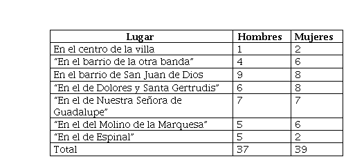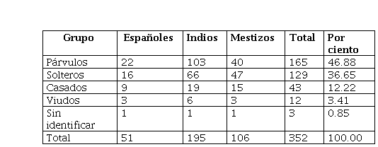 Empero, si sumamos los solteros, casados y viudos, notamos que 184 personas adultas perdieron la vida. Habiéndolas comparado con los 165 infantes fallecidos, se dedujo que la población adulta resultó un poco más afectada (52.27 %). Es importante puntualizar que esta última afirmación debe considerarse por las dificultades presentadas en los registros parroquiales. En principio, el párroco no siempre anotó las edades de los fallecidos. Por otra parte, se debe tomar en cuenta la posibilidad de que el mismo sacerdote anotara a los niños de 10 años como adultos, así lo muestra Cook (1982) para el caso de la Ciudad de México.