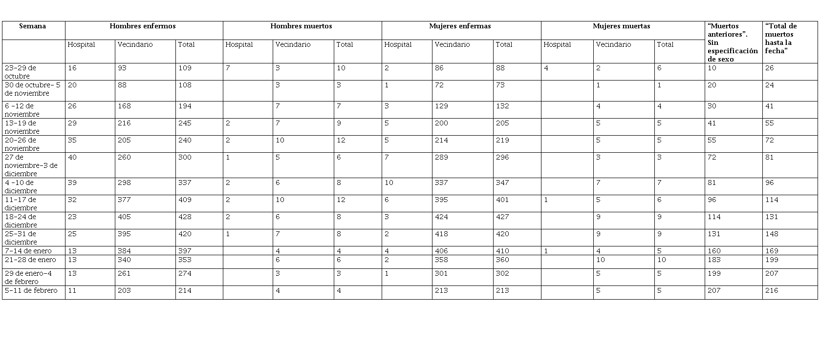 En el mismo esquema de la política sanitaria, el alcalde municipal, Pedro Andrés Marín, envió al virrey Branciforte reportes semanales en los que registró el número de personas enfermas y fallecidas en los hospitales de hombres (San Juan de Dios) y de mujeres (La Misericordia),7 así como en el vecindario (cuadros 1 y 2). Dichos reportes comprendieron el periodo del 23 de octubre de 1797 al 11 de febrero de 1798.