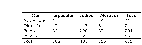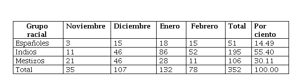 Ante la falta del registro sobre la causa de la muerte, se tomará como referencia el periodo de sobremortalidad. Veamos el caso de la epidemia de 1797-1798. Se ha mencionado que, de acuerdo con los reportes semanales enviados al virrey, la epidemia estuvo en la villa de Orizaba de agosto a febrero y que los meses de noviembre y diciembre fueron los de mayor impacto. Al analizar los datos parroquiales, se observó que en los años de 1797 y 1798 fueron registradas 463 y 753 defunciones respectivamente. Entre estos años, el periodo de noviembre de 1797 a febrero de 1798 fue el más crítico (gráfica 1). Durante ese lapso se contaron 352 fallecimientos. Al considerar esta última cifra como la totalidad, se observó que el grupo de indios fue el más afectado, seguido por los mestizos y españoles. Mientras que estos dos últimos sectores comenzaron a librarse de la epidemia en febrero, los indios continuaron enfrentándola (cuadro 4).