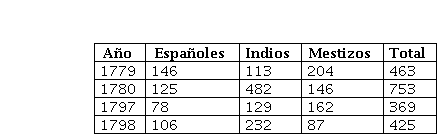 Por otra parte, las epidemias de 1797-1798 y de 1779-1780 afectaron en el mismo orden a los grupos socio-raciales, solo que la primera fue menos impactante, si consideramos el número de fallecidos (cuadros 4 y 8).
