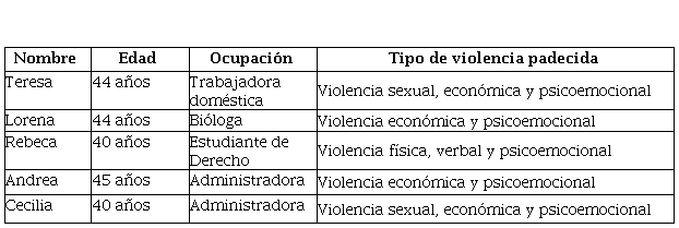 La muestra quedó conformada por cinco mujeres, cuyas edades se ubicaron entre los 40 y 45 años. Todas fungen el rol de madres y tienen hijos e hijas de distintos rangos etarios. La selección de la muestra de mujeres se realizó mediante el criterio de conveniencia; este permitió el acceso a las participantes que habían manifestado episodios violentos con su pareja o con algún familiar (Kerlinger, 2002). La información obtenida se expuso a través de fragmentos o relatos verbales y se analizó a partir de categorías construidas con base en el aparato crítico. Cabe señalar que se emplearon seudónimos para proteger la privacidad de las mujeres. A continuación, en la tabla 1, aparecen las características de las participantes: