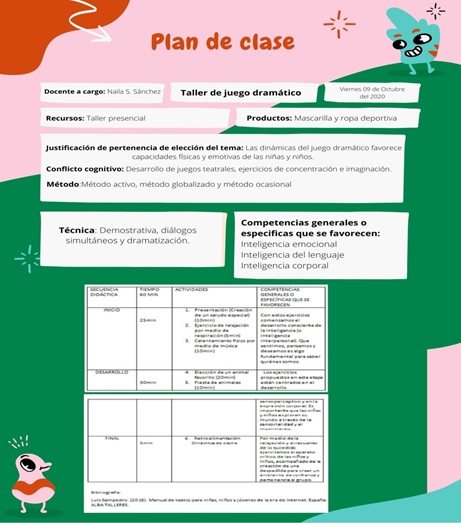De manera cuantiosa se ha comentado sobre la significación del juego dramático como estrategia para el desarrollo de habilidades, capacidades y actitudes en la primera infancia, a partir de las propuestas de Luis Sampedro y Zayda Sierra Restrepo; además se suma a los anteriores programas de estudio en la enseñanza básica, los cuales indefectiblemente recuperan las ideas de Isabel Tejerina Lobo, en los que se sitúa su aplicación en el ámbito escolar. No obstante, la reflexión propone que el juego dramático puede emplearse más allá de entorno escolar para favorecer el desarrollo cognitivo, tal es el caso del taller aquí presentado.