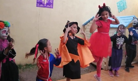 Una de las sesiones más significativas fue Juego a los disfraces, pues la emoción y el entusiasmo por la celebración del Día de Muertos hizo que las niñas y los niños estuvieran dispuestos a caracterizarse de catrinas, catrines y personajes del Halloween y recorrer las calles para pedir calaverita,3 o lo que es igual, un donativo de dulces o dinero. En esa dramatización, el disfraz y el maquillaje promovieron una mayor seguridad y plenitud. Si bien el maquillaje se relaciona con el uso de la máscara, elemento motor que, aunque en apariencia oculta, facilita la expresión de pulsiones emotivas: la función del disfraz no es ocultar la identidad, sino permitir la integración social de las niñas y los niños: