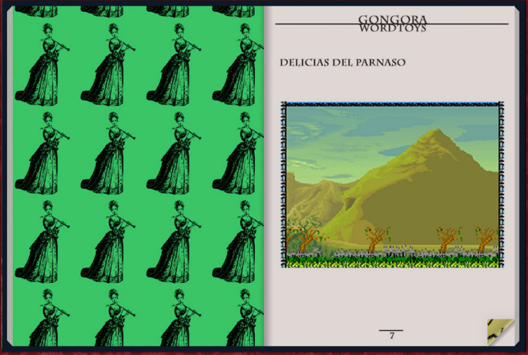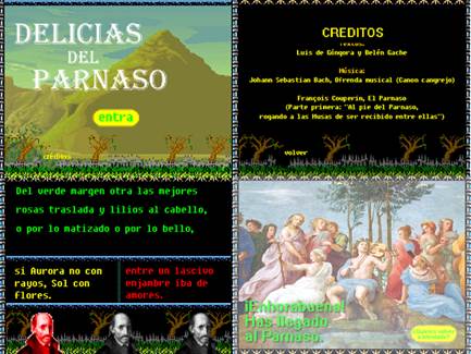 “Delicias del Parnaso”, por ejemplo, se plantea como un desafío donde el jugador debe descubrir el verso correcto[10] entre dos que se presentan y así, “emulando al genio barroco, alcanzar el Parnaso de los poetas españoles” (Gache, 2011: 7). Como sucede con el resto de los poemas, las instrucciones cuentan con un texto que explica la importancia de dicho lugar para los poetas y se lee un dejo de ironía con respecto a la posición privilegiada que implica en el siglo xxi. Con esta información el juego comienza.