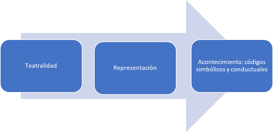 Algo semejante ocurre con el acontecimiento, si bien éste concibe otra manera la fusión entre la acción y la ficción mediante una demarcación alterada por el sujeto que mira (espectador), un objeto mirado (ficción) y otro sujeto (actor) que interactúa con ambas figuras, la teatralidad se estructura como el lugar en el que se encuentran códigos simbólico-conductuales, determinados por la reunión entre observador, actor y ficción, en unidad tempo-espacial. (Hernández, 2020). Por consiguiente, las representaciones se mueven, pero requieren de la presencia de los actores/personajes que dotan de sentidos diferenciados cada acción que realizan, se presentan así mismos en territorialidades acotadas por la interacción.