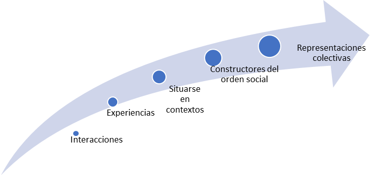Así, se configuran conectores para acceder y vincular con el entorno, el ámbito de comprensión se establece para los actores sociales mediante estrategias de intervención, (Pintos, 1995) en y desde la cotidianidad. Notamos cómo en el texto la producción de significados se establece como mecanismo de interacción, se reintegra de manera constante, se mueve, se reestructura:
