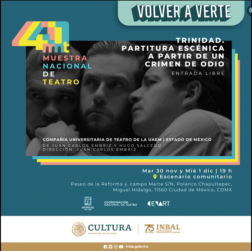 Trinidad es un texto de Juan Carlos Embriz[1] y Hugo Salcedo[2]. La obra tiene como referentes la diversidad y la interseccionalidad, una de las finalidades radica en un crimen homofóbico, de allí su implicación con la edificación de imaginarios que se identifican en el texto dramático; en la puesta en escena y en la recepción del público.