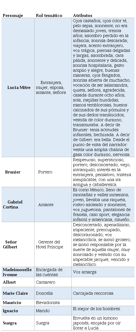 Ahora bien, personajes como Madeimoselle Ivonne, Albert, Marie Claire y Mauricio, que son parte del personal del hotel, tienen un rol temático asignado que se define en comparación con Gilbert y, principalmente, con Brunier. Ellos son quienes juzgan y se burlan de Lucía por ser una extranjera que espera a su amante y, además de loca, la catalogan de extravagante y especulan sobre la extensión de sus bienes: