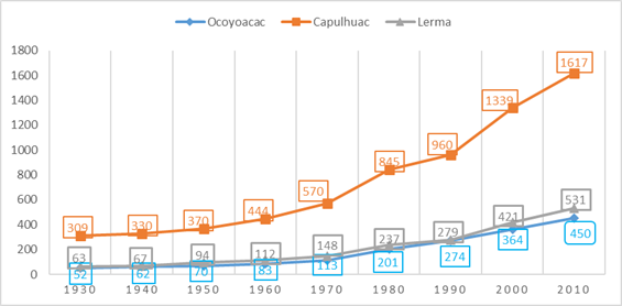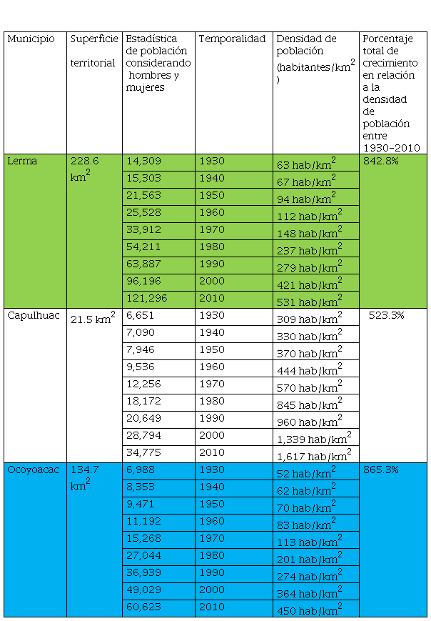 El cuadro 2 muestra los porcentajes de densidad poblacional, esto sustenta la idea del constante aumento demográfica en Capulhuac, territorio de pequeña superficie territorial por lo que existe mayor presión estadística en comparación con Lerma y Ocoyoacac, asimismo el porcentaje más pequeño entre 1930 y 2010 fue de 523.3% y un menor número de pobladores absolutos. Lerma es el segundo municipio con la mayor superficie territorial, tiene un porcentaje de crecimiento de población del 842.8% y el mayor número de pobladores. Ocoyoacac es el tercero y tiene el más alto porcentaje de crecimiento con 865.3%. En el área de estudio se registró un evidente crecimiento poblacional entre 1930-1950 en los tres municipios. En el caso de Lerma, la población aumentó un 50.7%, mientras que Capulhuac un 19.5% y en Ocoyoacac el 35.5%. Todo este crecimiento poblacional (1930-2010) generó demanda en recursos naturales en los tres municipios: agua, bosques, tierras agrícolas.