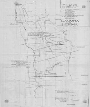 Los pueblos ribereños del segundo vaso de la laguna de Lerma gozaban de la posesión de los terrenos inundados que eran utilizados para diversas actividades económicas. Los ayuntamientos a veces recurrían al arrendamiento de ciertas tierras, pero estableciendo condiciones para no perjudicar a los vecinos en el aprovechamiento de la caza, la pesca y el corte de tule que realizaban (Alcántara, 2013). El 31 de octubre 1924 las zonas inundadas de la laguna de Lerma fueron declaradas propiedad nacional en el Diario oficial de la federación, y por lo tanto la posesión de las superficies territoriales representadas en el mapa elaborado por el ingeniero civil Fernando de Rozenzweig ya no les correspondía a los pueblos ribereños en sentido jurídico (figura 1).[5]