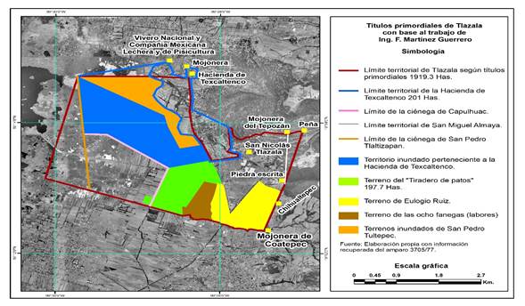 Como se puede observar en la figura 2, una parte del territorio inundado que pertenecía a la hacienda de Texcaltenco actualmente está incorporado al poblado de Santa Cruz Tultepec, antes Los Alcanfores y se ubica frente al rancho de la familia Capetillo. La hacienda de Texcaltenco tenía una superficie de 201 hectáreas y hoy se sitúan ahí los fraccionamientos Los Sauces, Rancho San Gabriel, Puerta del Carmen, Viveros de Chimaliapan, Rincón de Reyes, el rancho Capetillo, Las Tórtolas, La Fragua y Villa Americana (Alcántara, 2013). También la hacienda de Texcaltenco tenía gran parte de las tierras que hoy pertenecen a los vecinos de San Nicolás Tlazala.