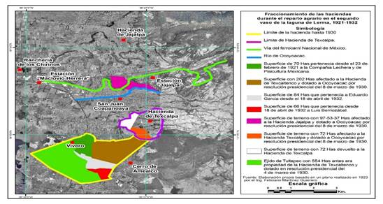 A partir de la Reforma Agraria se resolvió la demanda de tierras para los campesinos del área de estudio mediante el reparto agrícola. En consecuencia, se fragmentó la propiedad territorial de las grandes posesiones rurales, como el caso de las haciendas de Texcalpan y Texcaltenco. Este proceso tuvo varios inconvenientes para cumplir con los decretos de dotación a los pueblos circunvecinos, ya que muchas de las tierras estaban en las áreas recién desecadas o sobre la laguna y no había disponibilidad suficiente de tierras para dichos repartos. Esto reavivó varios conflictos o problemas añejos por la tierra entre los vecinos de Lerma (Tultepec) y los de Capulhuac (Tlazala), quienes no permitieron concluir con la asignación agraria esperada.