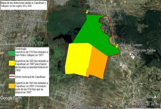 El oficio No. 46031 para darle debido cumplimiento a la dotación de ejidos a San Pedro Tultepec. A pesar de que 516-88 hectáreas que se refiere son las únicas disponibles en la ciénaga del río Lerma y adjunto remito a usted una heliografía del plano proyecto aprobado para que conforme a él se proceda a dar la posesión definitiva al poblado de referencia. En vista de la imposibilidad material de dar cumplimiento a la resolución presidencial y se reduce la dotación a 510 hectáreas (AMC, 1977).[10]