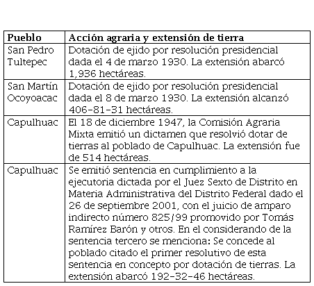 También los vecinos de Capulhuac solicitaron restitución de tierras, pero como esta vía resultó improcedente, se mencionó que las autoridades agrarias resolvieron convertirla en dotación, a quienes asignaron 514 hectáreas, de las cuales 322 hectáreas no fueron entregadas porque son propiedad federal, aunque Capulhuac tienen posesión del terreno mencionado. Por último, la gran presión demográfica en Capulhuac es un aspecto importante que contribuyó al desarrollo del conflicto agrario con Lerma, pues la población creció en ambos municipios y esto originó una mayor demanda de tierras.