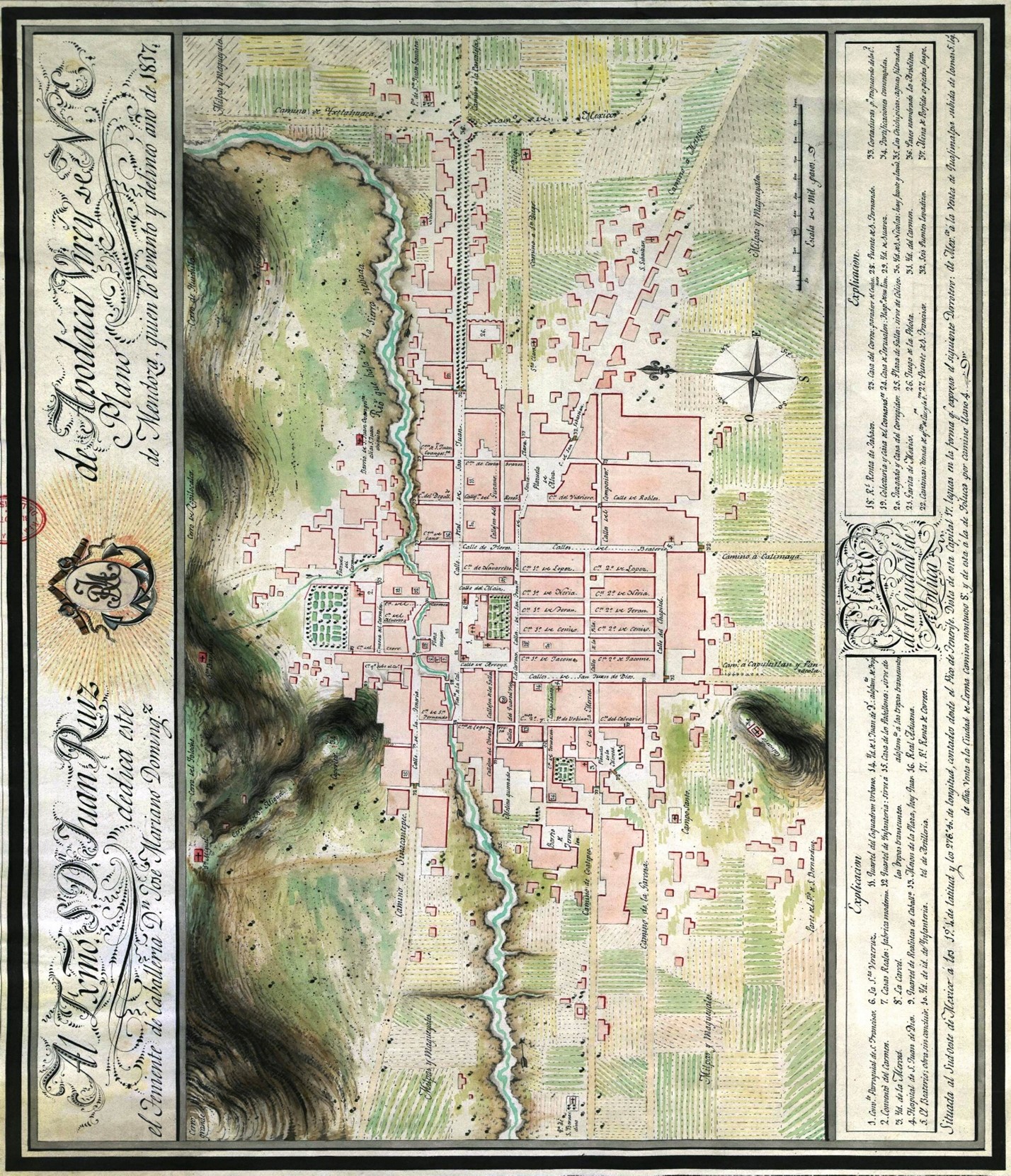 El mapa consta de dos cartelas; una en la parte superior y la otra en la inferior, pero constituyen un solo cuerpo escrito a mano con tinta china: Plano de la ciudad de Toluca. Situada al sudoeste de México a los 19°1’ de latitud y los 276°4’ de longitud, contados desde el Pico de Tenerife. Dista de esta capital 17 leguas en la forma que expresa el siguiente derrotero: de México a la Venta de Quajimalapa subida de lomas 5 leguas de distancia. Venta a la ciudad de Lerma camino montuoso 8 y de esta a la de Toluca por camino llano 4. Al Exmo. Sr. Dn. Juan Ruiz de Apodaca, virrey de N. E. dedica este plano el teniente de caballería Dn. José Mariano Domínguez de Mendoza, quien lo levantó y delineó. La escala gráfica es de mil pasos (696.5 m.), con diseño e ilustraciones a color. En él aparece la traza urbana con la nomenclatura de las calles, adicionalmente se identifican con números los edificios principales y la fortificación de la localidad. Otro elemento gráfico es la rosa de los vientos, que se observa en la porción inferior derecha, en forma de flor de lis.