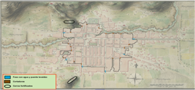 Los elementos de fortificación identificados en esta urbe fueron los más característicos de la época: las cortaduras, los fosos con agua y los puentes levadizos, obras defensivas que se plasmaron en un plano elaborado en años posteriores y que nos permite conocer un ejemplo de la manera en que las ciudades novohispanas pretendieron ponerse a salvo de las incursiones insurgentes. En el caso de Toluca, las obras defensivas aunadas a la militarización permanente de la ciudad fueron de gran utilidad contra el asedio e incursiones insurgentes.