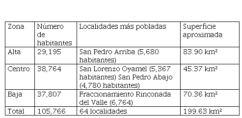 En cada una de las zonas mencionadas los procesos a estudiar son diferentes. La creación de localidades surgió de distintas maneras, pues casos, como en la zona alta, se fraccionaron para tener una mejor distribución de servicios públicos. En el centro se registró el mismo proceso, pero no tan marcado; en la zona baja existe un poblamiento creciente y, por lo tanto, también aumentó la demanda de nuevos sitios de asentamiento. Por otro lado, es posible advertir distintas actividades económicas en cada zona que, en buena medida, se encaminan a actividades terciarias, desde el comercio hasta los servicios.