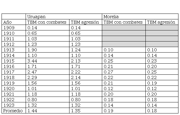 En el período final de la pax porfiriana (1909 y 1910) se hicieron evidentes las cifras bajas de mortalidad por violencia en Uruapan, aunque para esta última anualidad es notoria un incremento, en los años posteriores se dispara tal cifra, un aumento de diez o más veces (ver cuadro 1). El trágico resultado de las agresiones se muestra en la Tasa Bruta de Mortalidad específica por mil habitantes, de forma total y sin los combates. La tasa se calculó a partir de la población en el municipio en los años 1900, 1910, 1921 y 1930. Para tener una referencia respecto la situación que guardaba la capital del estado se obtuvo la misma tasa de estos, de forma total y sin combates.