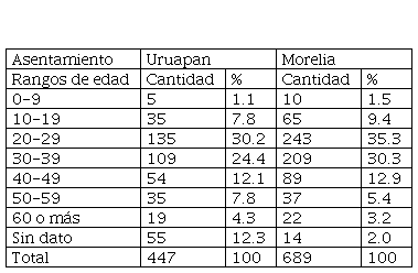 Asimismo, se considera a los que tenían entre 40 y 49 años y a los niños de 0 a 9 años, victimarios de las agresiones, tal es el caso de un niño en gestación, ya que la madre fue golpeada, así como un menor muerto por arma de fuego. En Morelia, los rangos muestran un comportamiento similar, pero los rangos de 20 a 29 y 30 a 39 tienen cifras mayores, conforman dos tercios del total, probablemente hayan tenido un mejor control en la anotación de la edad en las actas, ya que descienden los que no tienen ese dato, a diferencia de Uruapan, posiblemente haya tenido datos similares, respecto a Morelia.