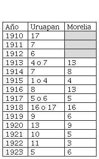Los años entre 1915 y 1918 fueron los más violentos en Uruapan, posteriormente hay un ligero descenso. Los datos de Morelia, entre 1913 y 1923, son inferiores respecto Uruapan, en promedio, trece veces menos de la TBM al tomar en cuenta el total de población en cada lugar. Este es un dato trágico que apunta a la ausencia de órganos de poder y sus mecanismos de control sobre la población en Uruapan, lo que desató una fuerte violencia con un alto costo de vidas humanas, a diferencia de la capital, donde se encontraba el gobernador y por lo tanto, había una mayor presencia de fuerzas militares que resguardaban la ciudad y aseguraban un control de la población.