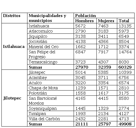 Otra de las variables importantes es la estadística poblacional vista desde los distritos de Ixtlahuaca y Jilotepec. En 1870 concentraban una población que sobrepasaba los cuarenta mil habitantes. Ixtlahuaca era el distrito con mayor población femenina en el estado, mientras que Jilotepec era el de mayor extensión territorial, con ciento noventa y seis leguas (Memoria, 1871). En ese año, Ixtlahuaca concentraba alrededor de 58 183 habitantes (Iracheta, 2016: 201),[19] mientras que el de Jilotepec tenía una población de 44 495 habitantes. Para 1877, la población de Ixtlahuaca oscilaba en 60 329 habitantes, la de Jilotepec en 49 908. Un año después la cifra aumentó a 62 964 habitantes para el primer distrito, mientras que para el segundo sumaba 50 242 personas (Memoria, 1879).