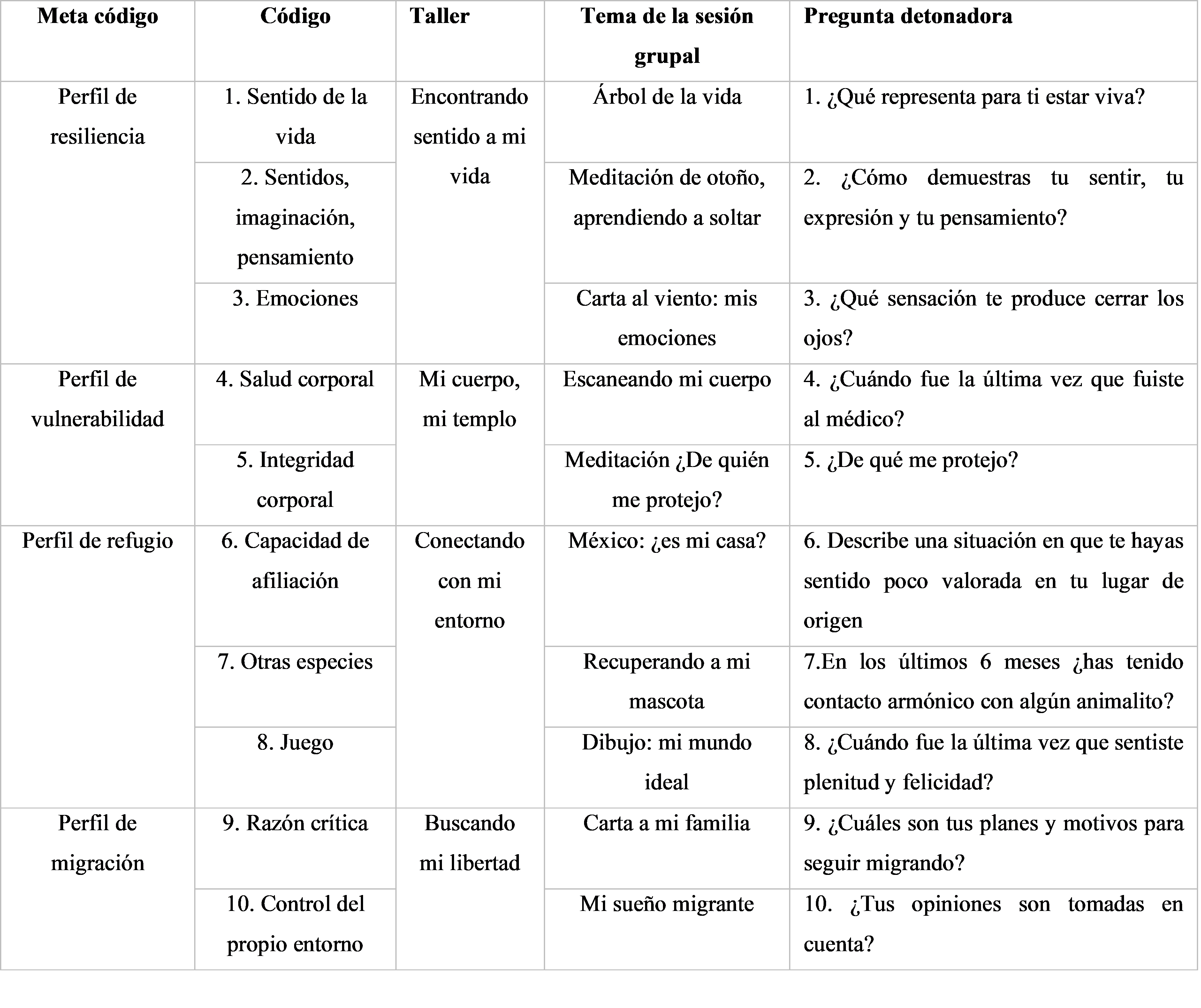 Se utilizó una estrategia de integración mediante la participación en grupos de enfoque, la cual se aplicó en una “Jornada Integrativa Mujer Migrante” (ver cuadro 1), dirigida a recuperar las experiencias subjetivas de migración en grupos de 3 y 10 personas; se abordaron las diez capacidades humanas centrales de Nussbaum (2002), trabajadas en 4 Perfiles de capacidades: Perfil de resiliencia, Perfil de vulnerabilidad, Perfil de refugio y Perfil de migración. La jornada completa se conformó por 4 talleres de 10 sesiones grupales recreativas, llevadas a cabo en los 12 meses de 2022. Para asegurar la privacidad y el respeto a las participantes, no se usó equipo de grabación ni se dan sus nombres reales; al final de la cita textual se incluyó un seudónimo.