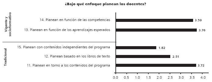 El enfoque de enseñanza tradicional alcanza una ponderación de 2.68 (promedio ponderado). Por su parte, la del enfoque vigente y socioformativo corresponde a 3.67, lo que denota la predominancia de este último, aun cuando el primero tiene una importante consideración en la planeación que elaboran los docentes.