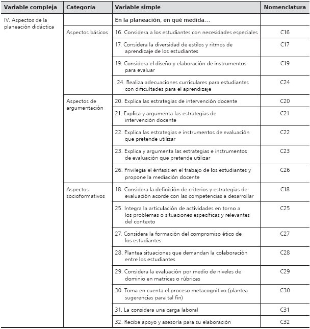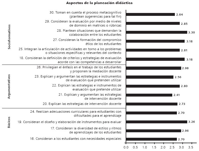Los aspectos de la planeación didáctica se agrupan en tres categorías: los que tienen como referencia el enfoque socioformativo, esto es, aquellos aspectos que favorecen el desarrollo de competencias y que estas sean transferidas a situaciones que el estudiante tiene en su ámbito contextual; los que tienen referencia en aspectos argumentativos, esto es, que alcancen a distinguir los motivos y situaciones específicas del porqué de las estrategias, procesos, materiales y evaluación, entre otros. Y finalmente los que tienen como referencia los aspectos básicos o esenciales acorde con el enfoque vigente, como adecuaciones curriculares, instrumentos de evaluación y diversidad de los estudiantes.
