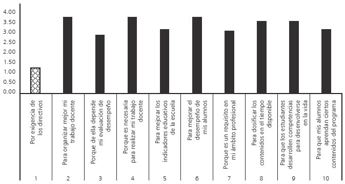 Aun cuando se reconoce, en gran medida, como una necesidad laboral (aspecto normativo) y tal herramienta del trabajo docente se ha constituido como un elemento evaluativo en el marco de la Reforma Constitucional Mexicana en el ámbito educativo (México, 2013; SEP, 2015a, 2015b, 2015c); es destacable la poca consideración (valor atípico inferior) que los profesores dan a planear para cumplir con la exigencia de los directivos. Estos hallazgos hacen suponer autonomía y responsabilidad profesional, elementos de las competencias éticas de los docentes (García García, 2010) que contribuyen al mejoramiento de la calidad de la educación básica de nivel secundaria.