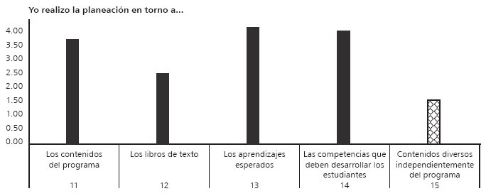 Esto indica que si bien, como se ha dicho en el subapartado Frecuencias de cada grupo de variables, inciso Enfoques de la planeación didáctica, aún persiste de manera importante la tendencia de planear con base en el enfoque tradicionalista, los profesores toman como referentes esenciales los contenidos que se señalan en el programa de la asignatura que corresponda, pues en el diseño curricular estos están alineados con los aprendizajes esperados y las competencias que se pretende desarrollen los estudiantes.