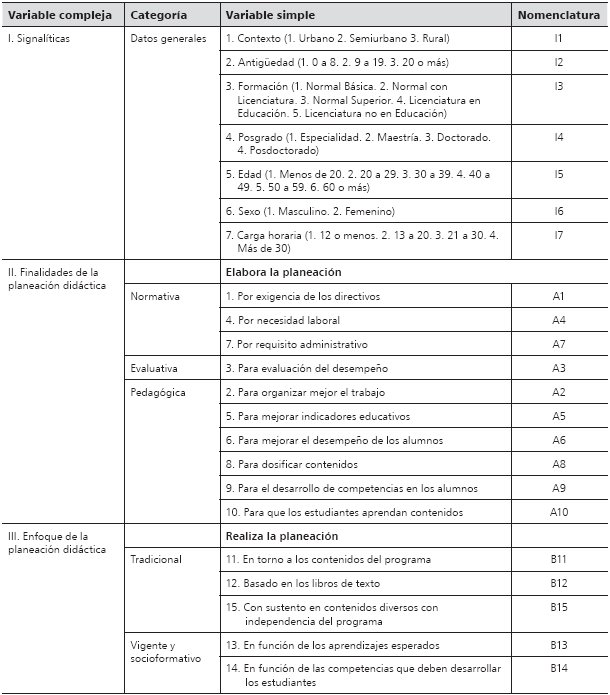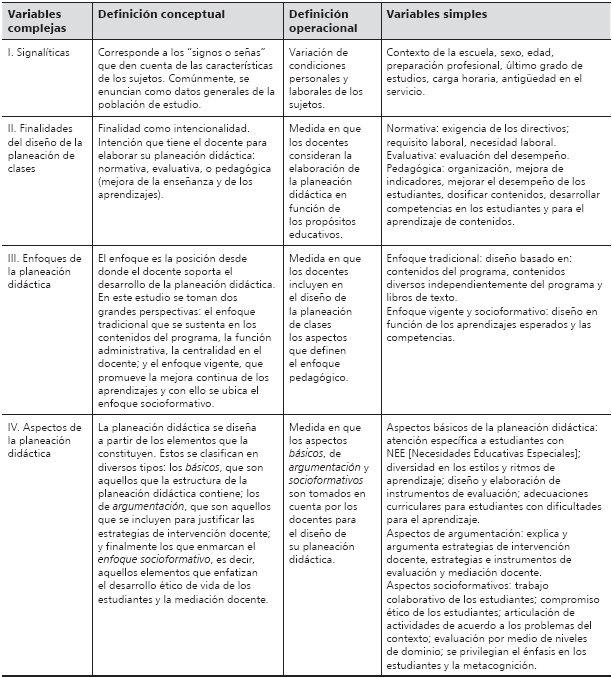 En función de los objetivos de investigación, se establecieron variables signalíticas, complejas y simples. Las variables, como su nombre lo indica, presentan una propiedad que puede fluctuar y cuya variación es susceptible de medirse u observarse (Hernández Sampieri, Fernández Collado & Baptista Lucio, 2006). En el anexo 1 se presenta la definición conceptual y operacional de las mismas.
