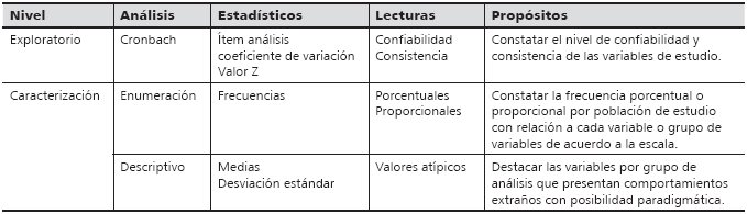 Se procedió con base en un esquema de análisis de acuerdo con el diseño de la investigación (tabla 1). Los procedimientos estadísticos se realizaron con apoyo de software especiales para el tratamiento de la información. Las lecturas se llevaron a cabo atendiendo las informaciones relevantes y con apego a los objetivos de la investigación.