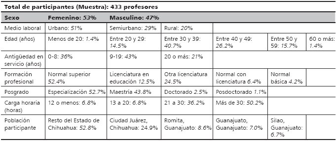 De los 433 profesores participantes en la investigación predominan los de sexo femenino, del medio laboral urbano y, con antigüedad en el servicio entre 9 y 19 años; asimismo quienes tienen edades inferiores a 40 años (56.6%), mayoritariamente en el rango de 30 a 39 años. Prevalecen egresados de normal superior; pero hay un 24.5% que cursó otro tipo de licenciatura (no normalista ni relacionada con el campo educativo). Hay preponderancia de quienes realizaron una especialización y una proporción importante (43.8%) de la maestría como último nivel de estudio. En su mayoría, tienen carga horaria de más de 30 horas, si bien el 36.2% tiene de 21 a 30 horas.