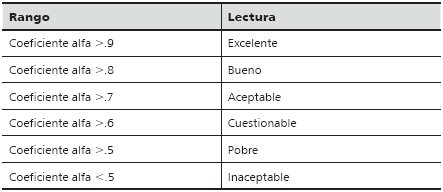 El análisis exploratorio permitió examinar las variables y sus comportamientos. Se empleó el estadístico de Cronbach, con la finalidad de valorar la consistencia interna del cuestionario empleado y constatar que presentara suficiente confiabilidad para poder extender los resultados a toda la población de estudio. Se tomó en cuenta el coeficiente Alpha de Cronbach y se ubicó cada variable en un rango de acuerdo a la tabla 4: