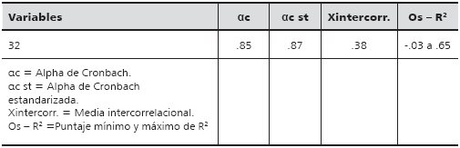 Los resultados indican que las 32 variables en su conjunto presentan un αc = .85; en los rangos de la tabla 3, el instrumento se ubica entre bueno y excelente; el Alpha estandarizado αc st = .87 se ubica un poco más alto, casi en excelente. No obstante, la intercorrelación es de xintercorr. = .38, lo cual indica que las variables tienen una interdependencia buena, existiendo una oscilación de r2 = -.03 hasta r2 = .65. Esta variación entre las correlaciones se da por la situación de que resultan dos variables con valores negativos.